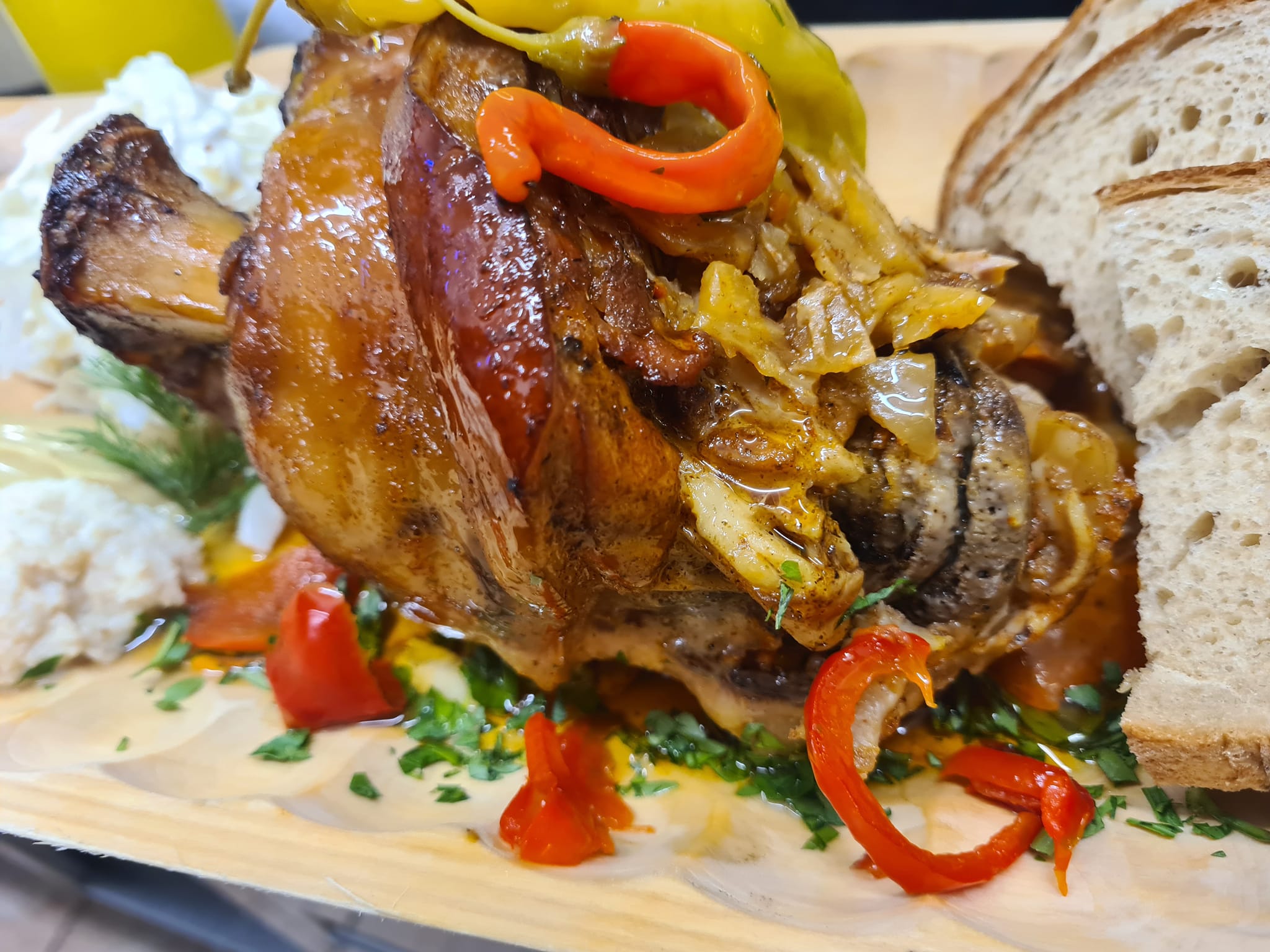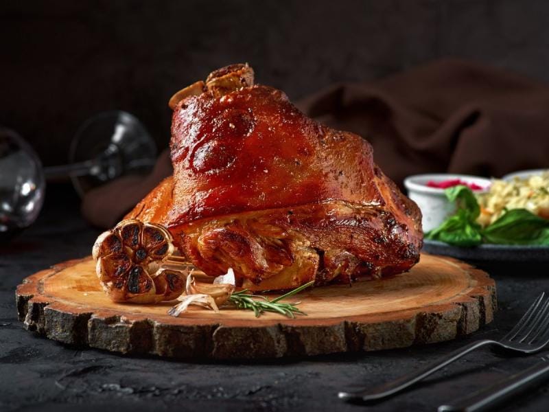 - Golonka pieczona w warzywach – pečené vepřové koleno v zelenině, podávané s hořčicí, křenem a domácím chlebem.